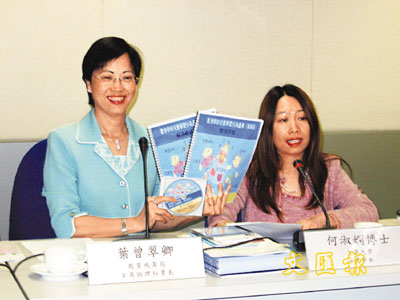 ■香港特殊學習困難研究小組研發出「學前兒童學習行為估量表(家長版)」,港大心理學系何淑嫻博士(右)表示,該估量表能夠點出潛在問題。左為教統局首席助理秘書長曾葉翠卿。 本報記者曾媚 攝