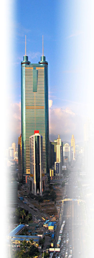 ■位於深南中路。高420米,共81層。於1996年完工。建成時是亞洲最高建築,也是全國第一個鋼結構高層建築。現為深圳市最高建築,位居目前世界十大建築之列。