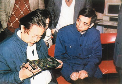 ■倪光南(右)1987年陪同時任中科院院長的周光召(左)參觀計算所公司(聯想集團前身),並向其介紹聯想漢卡。