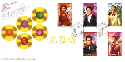 香港郵政推出首輯以香港流行歌星為主題的郵票,向五位歌星致敬,表揚他們對香港樂壇的貢獻。而首日封設計以金光奪目的唱片為主體,唱片中心為歌星的肖像,具收藏價值。