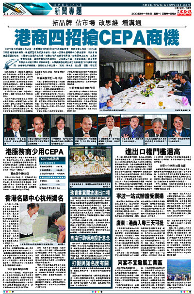 CEPA第三期措施公布之後,本報舉辦如何抓好CEPA商機座談會,港商在會上指出,CEPA第三期措施是港商轉型,轉變經營思維的黃金機會。港商一要聯合辦展銷中心開拓品牌,突出香港產品優質的特色;二要盡快佔領內地市場,否則07年內地對全球開放,港商便悔之已晚;三是改變競爭思維,靠低價競爭已無路可行,必須產品升級,走創新路線;四是要學會與內地的對口單位磋商和溝通,共同推動迅速解決地方政府落實CEPA措施的進程,改善審批手續繁複,證件發放不暢之局。 記者:李永青 吳文爾 攝影:張偉民
