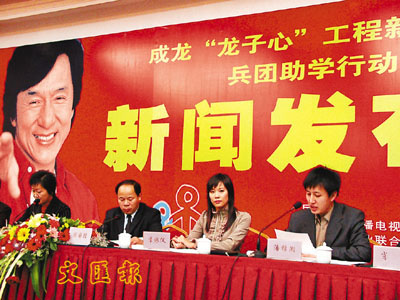 【本報駐新疆實習記者李若竹電】十一月五日下午,成龍「龍子心」工程工作組執行總監李詠儀來到新疆,出席了「成龍愛心新疆之旅」兵團助學行動新聞發佈會,宣佈成龍及龍子心工作組將第一次走進兵團開展捐資助學活動。