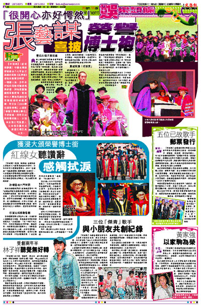 【本報訊】(記者 梁靜儀)中國名導演張藝謀自八七年首次執導的電影《紅高粱》得柏林影展金熊獎,一鳴驚人後,多年來所拍的電影均獲得極高評價,同時更屢獲國際電影獎項。香港城市大學為表揚他對電影藝術的卓越貢獻,昨日在「2005學位頒授典禮」上頒授「榮譽文學博士學位」予張藝謀。而昨日出席典禮的影人,分別有安樂公司負責人江志強及嘉禾老板鄒文懷及其女兒。