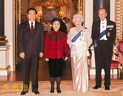 英女王伊麗莎白二世8日晚在白金漢宮舉行盛大歡迎宴會,熱烈歡迎主席胡錦濤和夫人劉永清對英國進行國事訪問。英女王強調,中國的發展引起了世界的注意和羨慕。胡錦濤在答辭中指出,現在中英兩國建立了全面戰略伙伴關係,雙方戰略利益不斷擴大,重點領域合作成果顯著,兩國人民的相互了解和友誼與日俱增。我們願同英國加強相互信任、擴大交流合作、為增進兩國人民的福祉、推動建設一個持久和平、共同繁榮的和諧世界而共同努力。唐家璇等中方陪同人員和英國王室成員、貝理雅等出席。