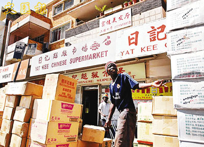 ■南非約翰內斯堡東部一個新建的中國城,圖為黑人工人正在落貨。 網上圖片