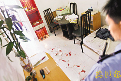 髮妻連傷兩人後,把染血菜刀放在露台洗衣機上,然後奪門逃去,現場遺下一攤血漬。其後,男傷者傷重臥在床上,而傷勢較輕的女傷者則報警求救。