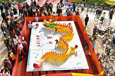 12日,人們在山東濰坊一食品公司前觀賞剛剛做成的「中華第一龍」蛋糕。據介紹,「中華第一龍」蛋糕長9.9米,有4個龍爪,是8名蛋糕師用10天時間做成的。目前正準備申請列入健力士世界紀錄大全。 中通社