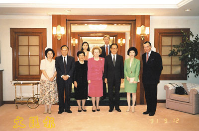 譚茀蕓(前左一)於1991年在新華社香港分社與周南社長(前右三)等接待英國首相撒切爾夫人(前中)、行政局首席議員鄧蓮如(前右二)、英國外交大臣簡達德(前右一)。
