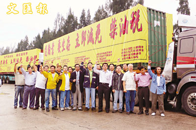 【本報訊】(記者 朱樂汶)近年油價加快減慢,20個運輸業界發起貨櫃車遊行,不滿政府徵收柴油稅,亦未有理會業界的經營壓力,昨日派出兩部掛上「要求政府減免柴油稅」橫額的貨櫃車,早上從落馬洲車場出發,遊行至中環及灣仔一帶。業界代表表示,航運交通界代表今日會於立法會會議上動議減免柴油稅,貨櫃車遊行會在立法會附近繼續進行,並沿途不停廣播要求減免柴油稅的口號。