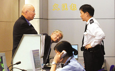 顧明均(左)昨日到警察總部報案,指涂謹申涉嫌以虛構人物身份登廣告支持普選,煽動市民上街。 本報記者羅蘭蓉 攝