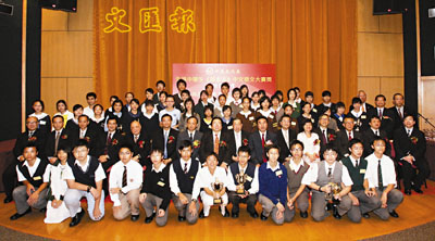 「全港中學生《基本法》中文徵文大賽獎」昨假香港中央圖書館舉行頒獎典禮。比賽吸引全港50間學校逾萬名學生參與,鄧英喜中學中七學生李夏和另外88名同學分獲金、銀、銅、優勝及嘉許獎項。 本報記者:劉越山、莊海源