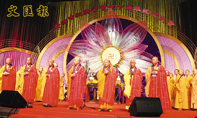■香港佛教聯合會舉行60周年鑽禧慈善齋宴,由覺光長老主持祈福儀式。 本報記者沈清麗 攝