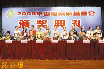 【本報駐浙江記者李晨杭州電】2005年度香港桑麻基金會第12次頒獎典禮,日前在浙江理工大學隆重舉行。在本次桑麻獎頒獎大會上,首次頒發了桑麻基金會成立以來的科技大獎。年臻九旬的基金會主席、香港紡織界耆宿查濟民攜夫人劉璧如專程赴杭參加盛典。