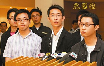 ■各大專院校代表會見李國章,表達對大專教育的意見,包括樹仁學院學生會外務副主席陳兆豪(左)、余冠威及浸會大學外務副會長陳嘉俊。本報記者張立新攝