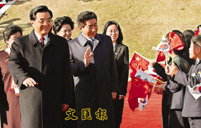 【本報訊】據新華社16日報道:當地時間下午3時,胡錦濤和夫人劉永清乘車準時抵達總統府。盧武鉉和夫人迎上前去,向他們致以親切問候。軍樂隊演奏兩國國歌。盧武鉉陪同胡錦濤檢閱了三軍儀仗隊和身著傳統民族服裝的禮兵。