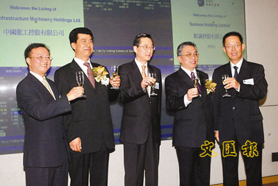 中國龍工主席李新英(左二)與順誠控股主席郭山輝(右二)慶祝同日上市。 本報記者張偉民 攝
