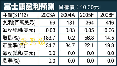 以現水平計,05年市盈率為22.1倍,稍低於全球同業平均值,建議6個月目標價為10港元(昨收報9.70元),相對於23.8倍05年市盈率。