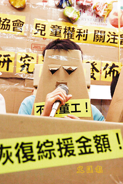 社區組織協會幹事施麗珊表示,本港貧窮問題惡化,福利削減引發童工問題,「99年、03年政府減綜援金的數字是雙位數,對家庭是很大損害,對兒童是完全應付不到,連基本學習開支都不可,因為家庭貧窮,小孩子也牽連要工作幫補家計。」她擔心,貧童缺乏資源支援發展,加上社會歧視,令他們的自尊心低落,日後更難脫貧。