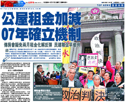 繼領匯官司後,房委會在租金官司中再下一城。終審法院昨日裁定房委會勝訴,無須檢討租金及不用將租金調整至低於住戶入息「中位數」一成的水平。不過,雖然官司勝訴,房屋條例卻仍存在漏洞,房屋及規劃地政局局長孫明揚表示,政府明年會向立法會提交修例草案,冀07年落實租金可加可減機制,而短期則會推出租金紓緩措施。有房委會委員建議即時免租2至3個月,但目前仍未有定案。