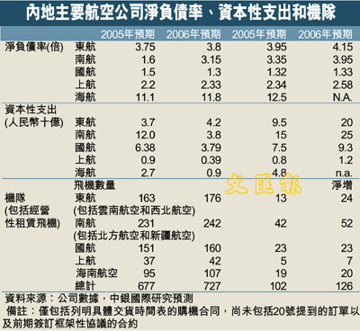中國民航總局預計今後5年內地飛機數量將翻一番。中國民航總局預計今後5年內地每年將新增飛機100-150架左右,到2010年飛機總量將達到1,400架左右,年均複合增長率達15%。展望2006年,我們預計航空需求的增長率為12-15%,而飛機座位的增長率為15-17%,因此,明年內地可能會出現運力供應過剩的情況。