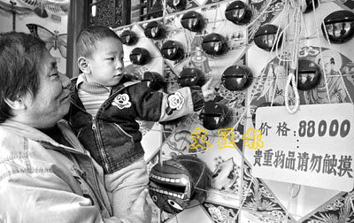 23日,蘇州山塘街上一家「郭氏風箏會館」內,標價高達88,000元的「板鷂」風箏吸引了路人的目光。該風箏由上百個大小不同的葫蘆組成,放飛時,這些葫蘆會發出不同頻率的高低音,像一支樂隊在空中合奏。新華社