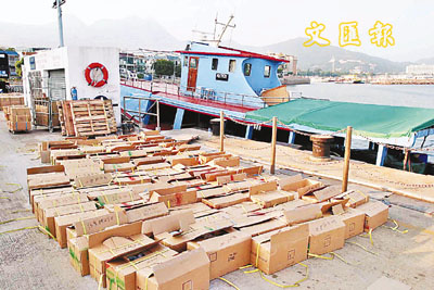 涉嫌走私色情光碟的貨船被扣留在水警總部,岸上一箱箱的就是檢獲的色情光碟。