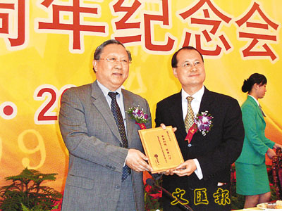 ■中國科學院院長路甬祥(左)向基金創辦人、香港新華集團主席蔡冠深贈送紀念品以表祝賀。
