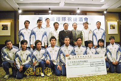 【本報訊】(記者 潘天惠)香港業餘田徑總會昨日為田徑隊本年度在各項大賽取得1金3銅「彪炳」戰績舉行祝捷會,大部分得獎運動員均有抽空出席,港協暨奧委會會長霍震霆就頒發合共41萬4千港元獎金給成績出眾的運動員,其中年紀輕輕的鄧亦峻就獲得22萬2千港元。事前,他還呆然不知:「呀,你們(指記者)看錯了,不會這麼多吧?」。
