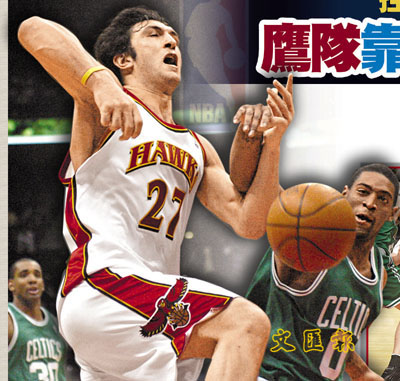 鷹隊中鋒柏古利亞(左)上籃時遭對方後衛格連侵犯。 美聯社