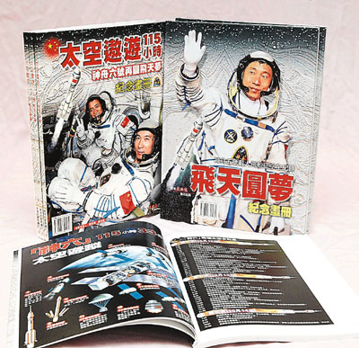 本報03年推出的紀念中國首位太空人楊利偉征空成功的《飛天圓夢》紀念畫冊,銷量達到2萬本。今年再接再厲,推出《太空遨遊115小時—神舟六號再圓飛天夢》紀念畫冊,全書128頁,收錄數百幅珍貴圖片及數十篇深度報道,詳細披露兩名太空人由訓練、獲選、升空及凱旋歸來的每一過程,又直擊鮮為人知的科學實驗及航天基地,至今已迅速賣出逾萬冊。讀者欲珍藏該本極具收藏價值的畫冊,可致28739890或28739889查詢。