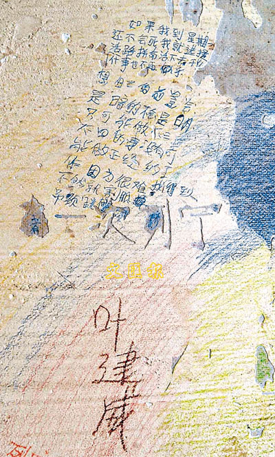 事後,葉父才發覺愛兒臨終前,在其上格碌架床的牆壁寫下死前心聲:「如果我到星期一還不會死,我就選擇活路拚命活下去,什麼事也不在乎,想自己的前景是暗的,不會是明,只可能做不三不四的事,沒有可能做正經的工作,因為很難找得到,不然就割脈吊頸跳樓死。葉建威」,遺言雖用藍色原子筆,但署名則改用紅色蠟筆。