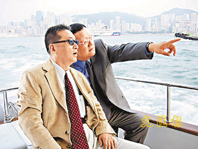 李敖大陸文化之旅最後一站選在本港。圖為劉長樂(右)陪李敖遊維港。 王善勇 攝