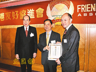 【本報訊】(記者 江揚)香港友好協進會日前假香港銅鑼灣世界貿易中心舉行宴會,祝賀該會2005年榮獲勳銜的會友。中央駐港聯絡辦公室秘書長趙廣廷作主禮嘉賓,並致送紀念品給獲獎者。該會主席李東海、司庫林貝聿嘉、董事胡經昌、陳有慶、李國強、尹德川、張閭蘅、趙曾學韞等款待嘉賓。中聯辦協調部部長王永樂暨各界嘉賓出席晚宴。