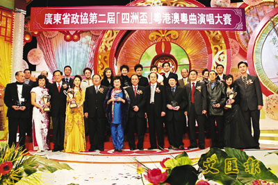 嶺南大學大會堂日前高朋滿座,廣東省政協第2屆「四洲盃」粵港澳粵曲演唱大賽於上址隆重舉行,來自粵、港、澳3地的粵曲精英,分別演繹多首經典名曲,經過一番激烈競逐,最後由來自廣東的李蕙雯、澳門選手吳國照勇摘本屆大賽金獎,廣東省政協主席陳紹基向他們頒發了獎盃及獎金。賽事盛況將於12月3日晚8時30分在亞洲電視本港台播出,讓更多粵曲愛好者分享!