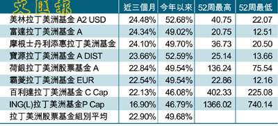 佔近三個月榜首的美林拉丁美洲基金,基金在2002、2003和2004年表現分別為-20.06%、70.79%及44.7%,基金最差季度收益和標準差為-29.71%及21.8。