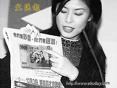 國民黨以「總統」陳水扁、「行政院長」謝長廷、「前總統府副秘書長」陳哲男、前高捷副董事長陳敏賢等人照片合成千元鈔票圖樣,刊登廣告,批評民進黨「財團治國」,並將正面「中華民國中央銀行」字樣,改成「財團治國禿鷹銀行」,指控「他們愛鈔票,我們有選票」。