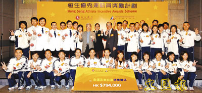 恆生銀行昨日舉行「恆生優秀運動員獎勵計劃」頒獎典禮,更由其副董事長柯清輝、奧林匹克委員會會長霍震霆同香港體育學院主席李家祥負責頒發獎金,合共頒發79.4萬元既獎金,得獎既都係今年雯10屆全國運動會同第4屆東亞運動會得獎既本地運動員。