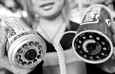 ■12月2日,在杭州市河坊街一家工藝品商店裡,顧客展示兩款可樂罐造型的電話機。這種電話機的按鍵在罐底,售價也不貴,頗受年輕人喜愛。 新華社