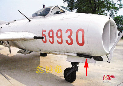 ■殲-6配有3門航炮,威力強大,令敵機喪膽。箭嘴所指為其中在翼根及機頭下的兩門航炮。