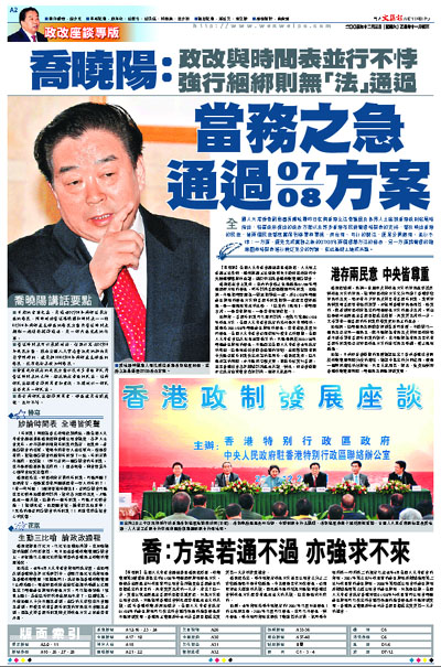 全國人大常委會副秘書長喬曉陽昨日在與香港立法會議員及各界人士座談香港政制發展時指出,特區政府提出的政改方案以及許多香港市民對普選時間表的支持,都反映出香港的民意,這兩個民意都應當得到尊重和重視,而合理、可行的辦法,便是分開處理、並行不悖:一方面,優先完成當務之急的07/08年兩個選舉方法的修改,另一方面就普選的路線圖和時間表進行廣泛充分的討論,在此基礎上達成共識。