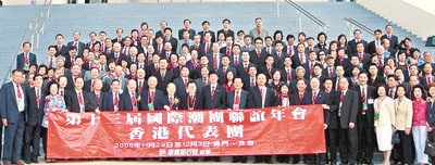 自1981年首屆國際潮團聯誼年會在港舉辦以來,每2年一屆的年會成為全世界潮籍人士聚首的盛會,今屆第13屆國際潮團聯誼年會於11月30日在澳門隆重舉行,來自20多個國家和地區,3000多名代表參與盛事。由香港潮屬社團總會主席蔡衍濤任團長的300多名香港潮屬代表赴會,與海內外鄉親聚首濠江,共謀攜手合作,促進工商,服務社會大計。團長蔡衍濤盛讚今屆年會內容豐富,再次展示了潮州人在政治、經濟、文化方面的風采,令身為潮州人感到驕傲與自豪,收穫甚豐!