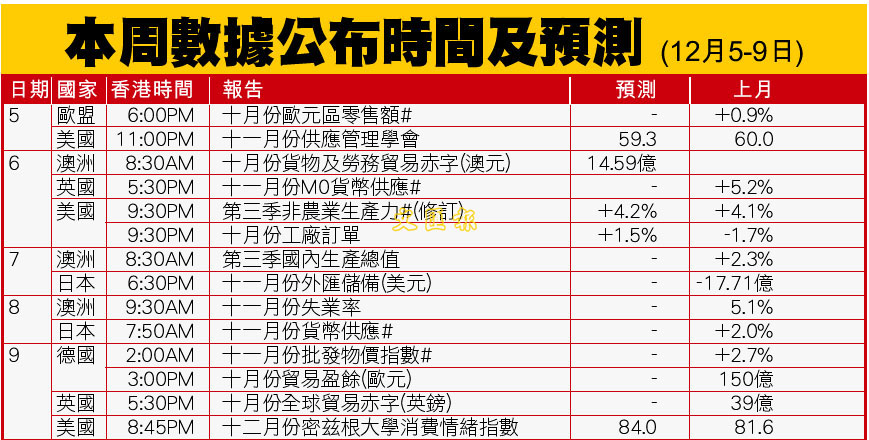 本周數據公布時間及預測 (12月5-9日) (圖)