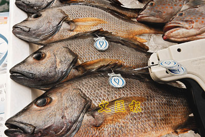 香港蘆荻灣優質養魚場推出的海產均有防偽標籤。本報記者趙焜崗 攝
