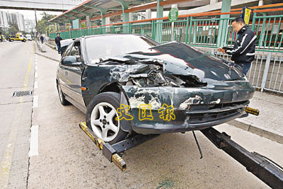 在龍門路撞專線小巴的私家車車頭嚴重損毀。