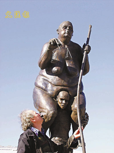 由丹麥設計師創作的「白種女人騎有色人種」的雕塑,上重下輕,極易造成危險,保險公司拒予受保。