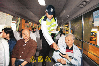 政府表示會加強向市民宣傳,提醒他們有責任佩戴安全帶。圖為交通警員向小巴乘客派發單張。