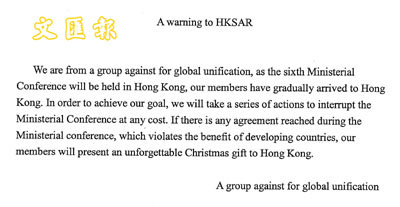 該封匿名信主題是「警告香港特區」(A warming to HKSAR),內容大致是說:因為世貿第六次部長級會議將在港舉行,我們的會員會陸續抵達香港,並會不惜任何代價干擾會議的進行。假如在會上有任何損害發展中國家的利益的協議達成的話,我們會送一份很難忘的聖誕禮物給香港。下款為「A group against for global unification」。該信通過郵寄,明顯是本地投遞。