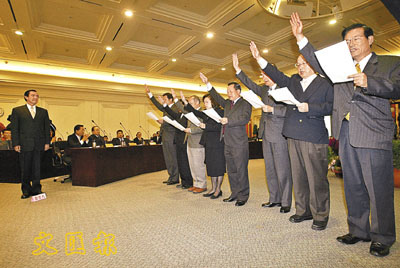 ■國民黨勝選後,昨日在中央黨部舉行中常會,甫當選的國民黨籍縣市長,在主席馬英九(左)監誓下,進行「廉能宣誓」。 中央社