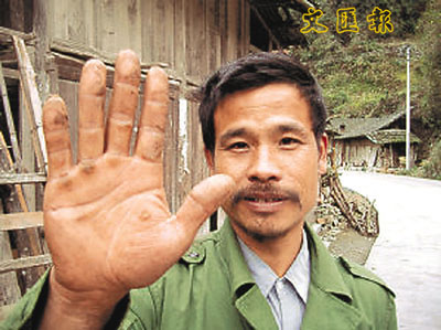 ■村民江桂和伸出因為割蘆葦而割出滿手血繭的手。網上圖片
