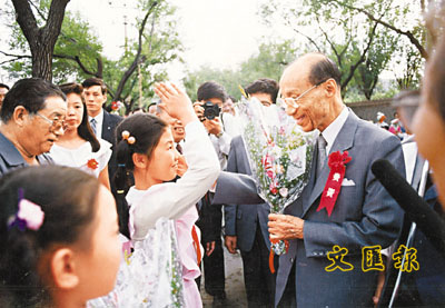 ■1992年8月15日,逸陽小學奠基儀式後,少先隊員代表向邵逸夫獻花,感謝他對天津教育的無私奉獻。